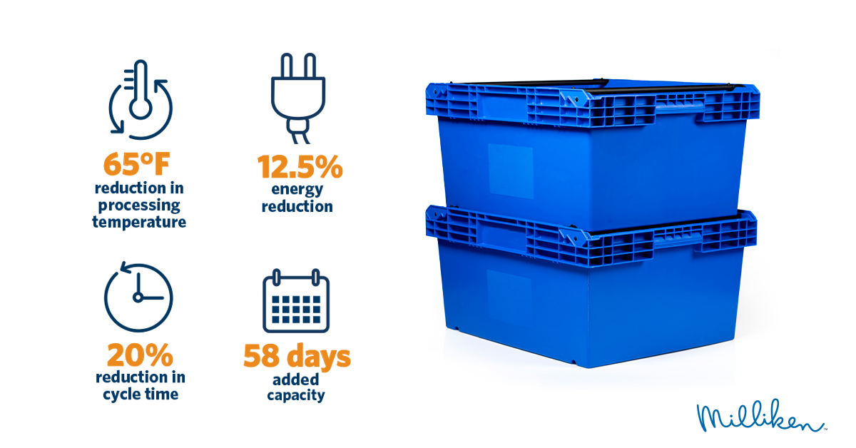 In another case study, a manufacturer of material handling containers was attempting to improve the output of its injection molding machines. While the company was investing in new presses they still were fighting with capacity constraints. They considered the use of resins with better melt flow characteristics for faster processing, but the physical performance was not acceptable and the cold temperature impact properties fell below an acceptable range.